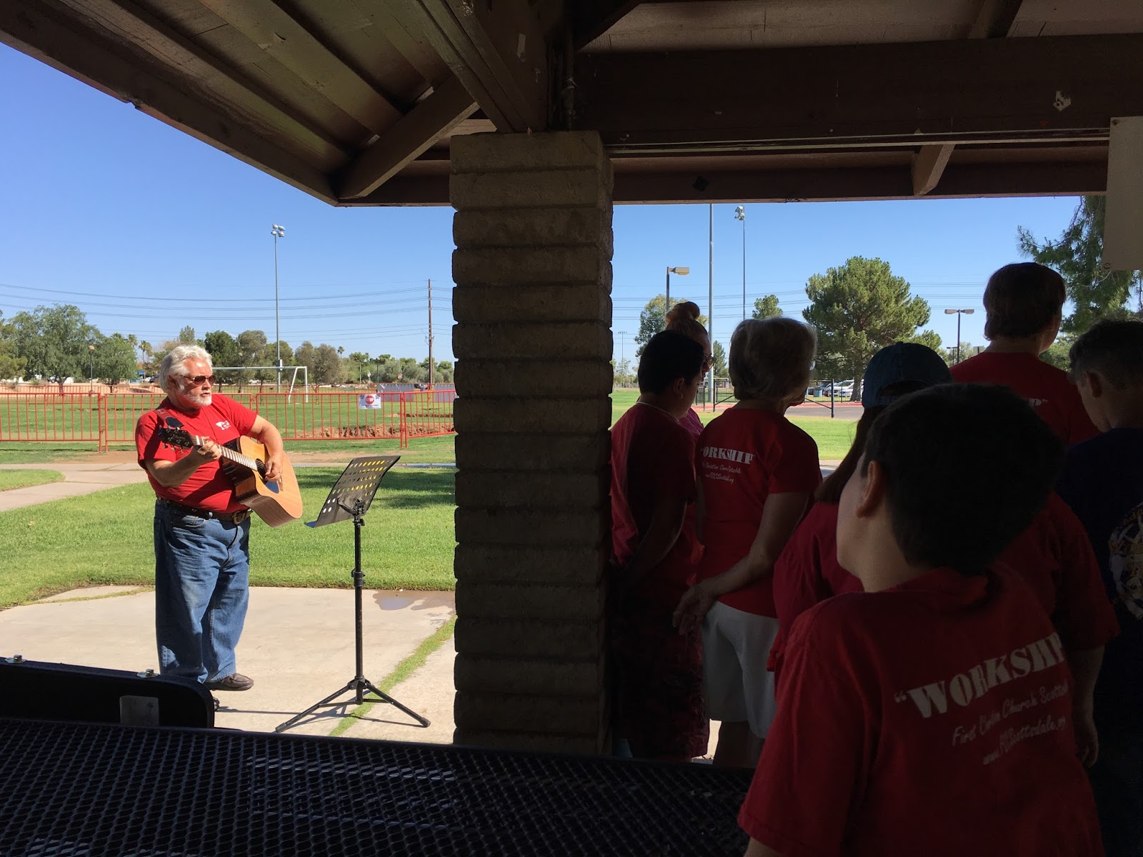 The folks who were a part of our WORKship Service in the Community gathered for a brief prayer service at the ramada at Chaparral Park before heading over to the Ronald McDonald House to cook and clean and wash windows on behalf of the 35 families that are currently residing there while their loved ones are receiving treatment at one of the nearby hospitals.